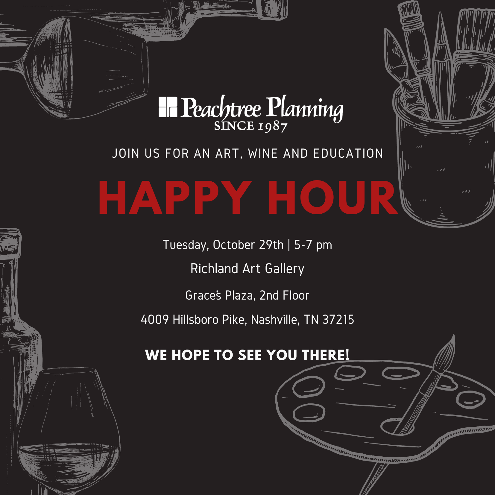 Peachtree Planning Art & Wine Happy Hour October 29th at Richland Art Gallery